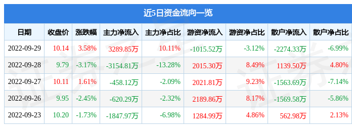 资金流向数据方面,9月29日主力资金净流入3289.85万元,游资资金净流出1015.52万元,散户资金净流出2274.33万元。