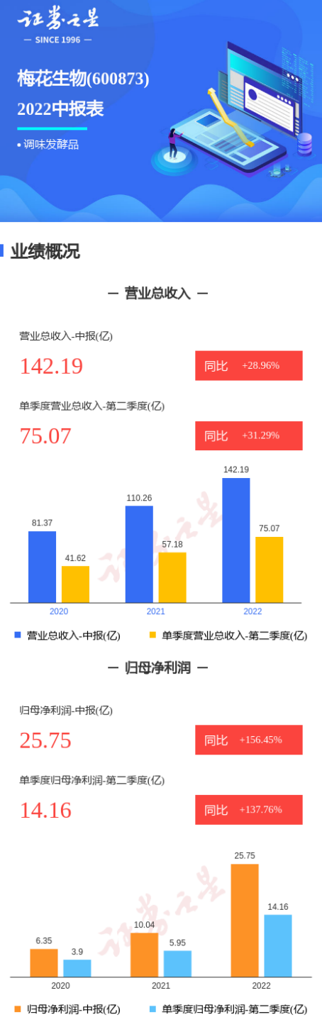 除了大手笔分红以外,梅花生物还是A股第一家公布2022年中报的公司,从公司业绩表现来看,确实有着十足的底气。
