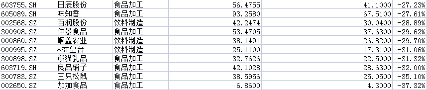 加加食品、三只松鼠(300783)、良品铺子位列跌幅榜前三名