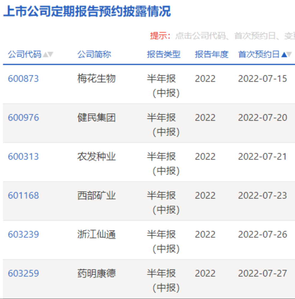 上交所上市公司半年报预约披露时间出炉,梅花生物(600873)(600873)拔得头筹,将于7月15日率先披露,健民集团(600976)(600976)7月20日披露,农发种业(600313)(600313)7月21号披露。