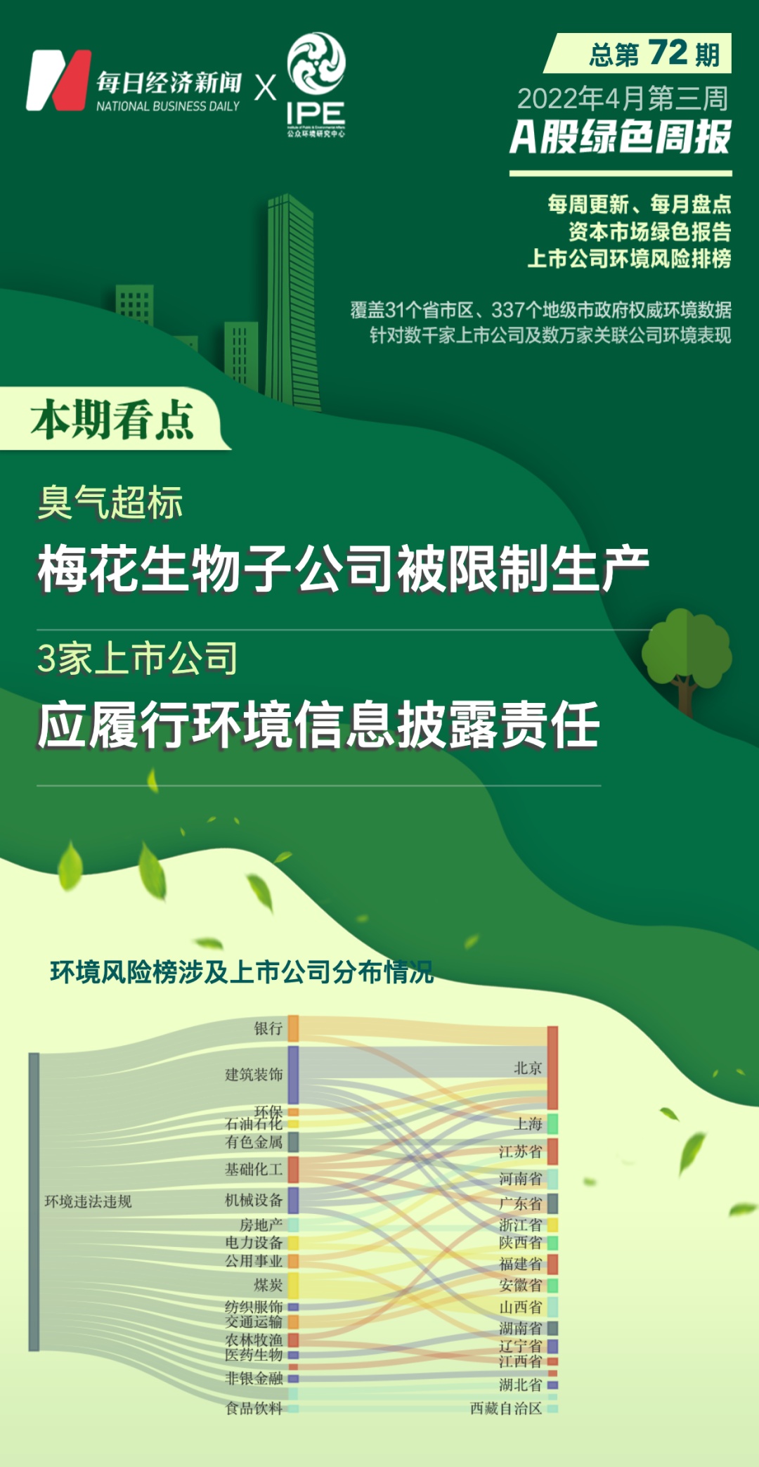 梅花生物(600873)全资子公司被限制生产,3家上市公司应履行环境信息披露责任……2022年4月第三周哪些上市公司的环境保护与信披责任亮起了红灯?且看A股绿色周报第72期。