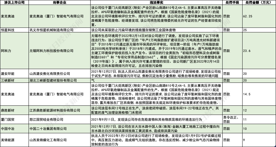 上市公司及其控股企业因环境违规违法被罚款金额前十