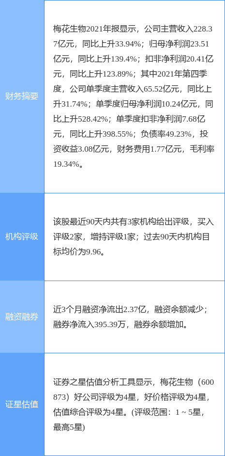 2022年3月14日,华西证券研究员周莎发布了对梅花生物的研报《氨基酸龙头表现亮眼,净利润创历史新高》,该研报对梅花生物给出“买入”评级。证券之星数据中心根据近三年发布的研报数据计算,该研报作者对此股的盈利预测准确度为75.26%。