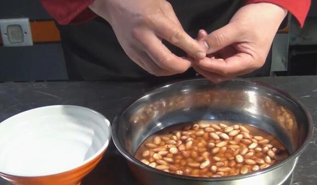 3、把泡好的花生米把外皮去掉(去外皮主要是因为花生的外皮比较涩,吃起来口感不好)