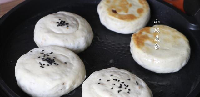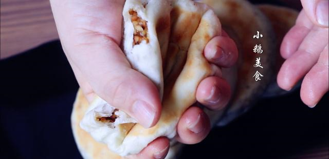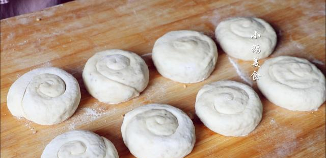【7】把剂子切面朝上,按扁,擀成长方形,先擀长,再擀宽。再铺上一层馅料,两边向中间折叠,再从一端卷起,尾端按薄一点,压在饼子下方。全部做好之后,不需要二次饧发了,从最先做好的4个开始烙。做的早的饼子已经饧好了。