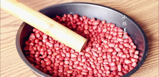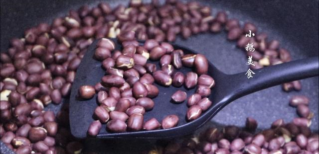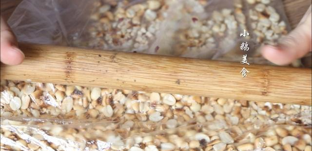 【2】炒花生,花生200g,放入锅中小火炒熟,全程不停搅拌,以防炒熟,炒到花生发出噼啪声响,外衣颜色变深,裂开,就可以了,盛出放凉,放凉之后的花生可以轻松搓掉外衣,然后放保鲜袋内擀碎备用。