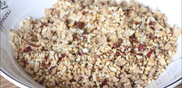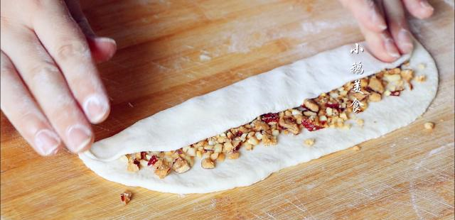 【4】把切好的红枣和擀碎的花生放一起,再稍微加一点食用油,搅拌成非常湿润的状态,红枣本身是甜的,所以馅料是有一定的甜度的,爱吃更甜的,可以加适量白糖或者红糖。如果想早上现做现吃,可以把面和好,放冰箱冷藏发酵1夜,馅料也准备好,第二天早上自接做。