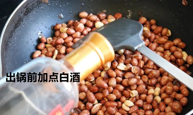 出锅前,散入一勺白酒,之所以要这样做,就是利用出锅前,花生米的热量,快速使白酒的挥发,从而带走花生一部分水汽和外皮的水分,这样出锅后,才不会因为垒叠在一起,让热气弄潮皮软。
