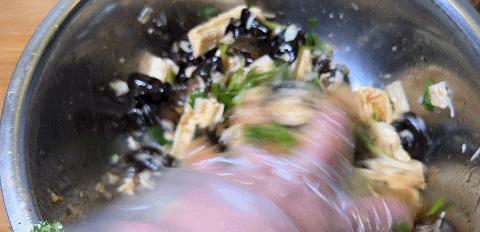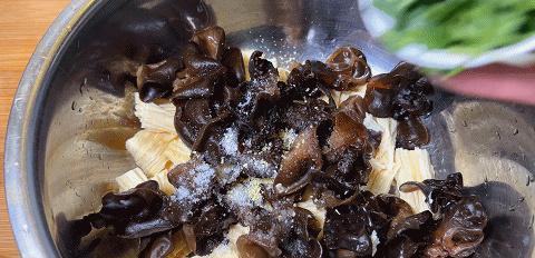 10.把挤干水分的腐竹放入盆内,加入挤干水分的木耳,加入食盐,白糖和鸡精