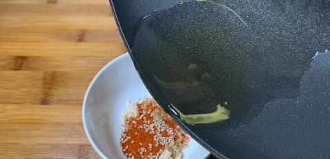 4、用热油激出蒜末,辣椒粉和白芝麻的香味