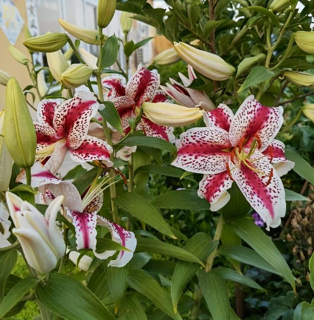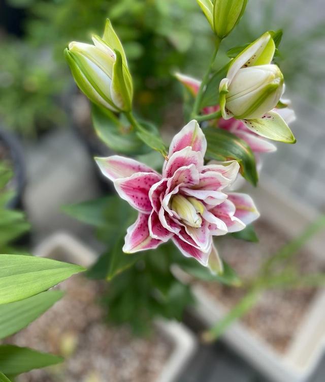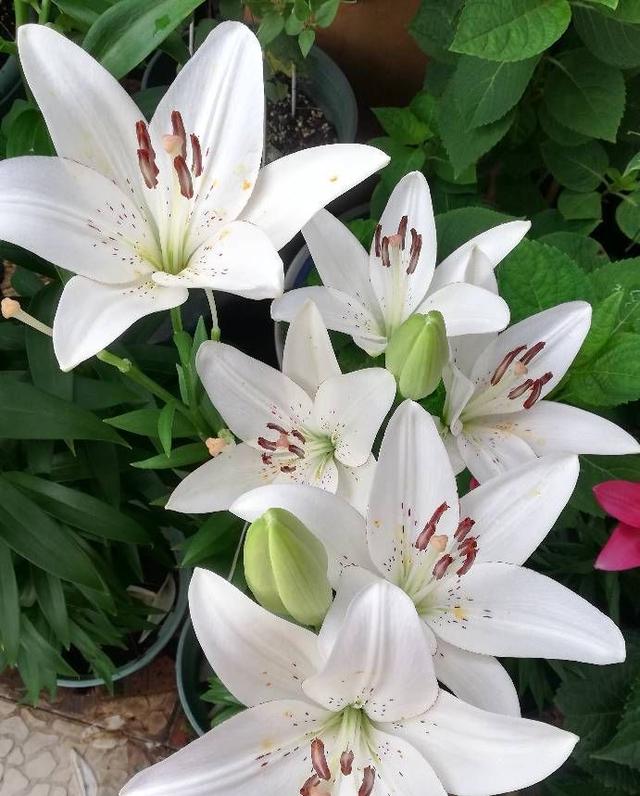 百合花喜欢阳光,怕阴暗潮湿的生长环境,不喜积水,所以盆土一定要排水良好,不能让盆土一直有积水,当然浇水要适量,也不能长期不浇水,放在室外养也是很省心的。春季生长期一定要多浇水肥,放在光照充足的地方养,这样它的枝干更加壮实,不容易倒伏,而且枝子上的花苞会分化更快,花苞数量更多一些。