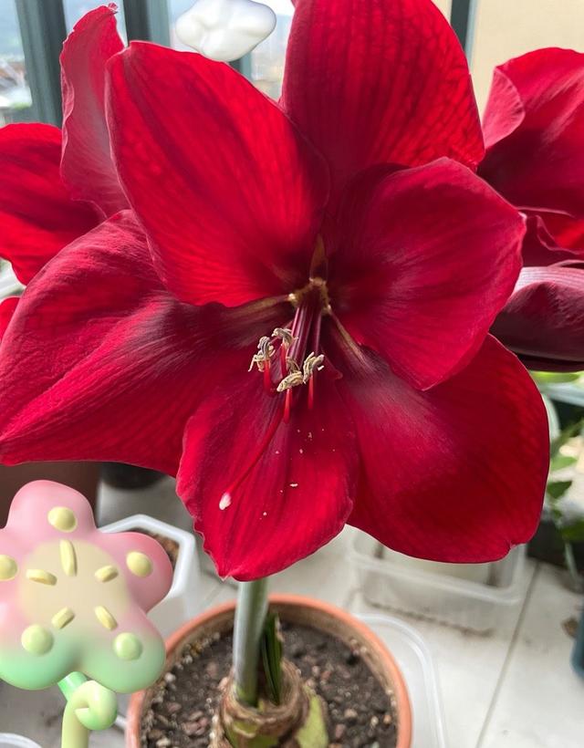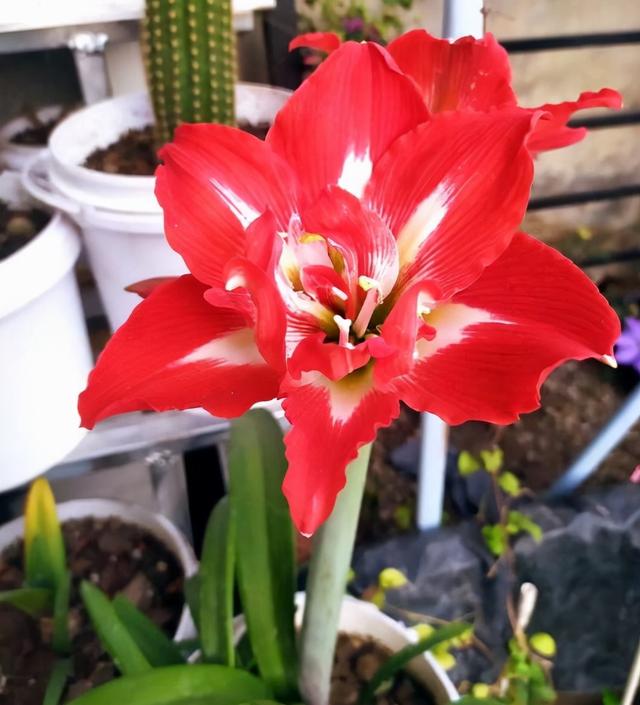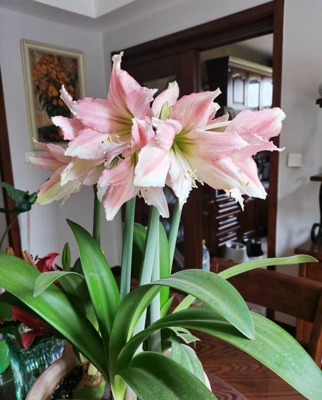 朱顶红是一种好养的花儿,有的花友养的朱顶红,一年开几次轮花,天冷的时候,温度降低的话,可以搬入室内养,只要做到减少浇水,保持盆土略干的状态的就可以了,有的朱顶红品种比较勤花,像白肋的话,在南方地区,一年不止开一次花,可以开花好几茬,春秋冬三个季节都比较勤花,而且花朵花瓣非常大,颜色鲜艳亮丽耀眼。