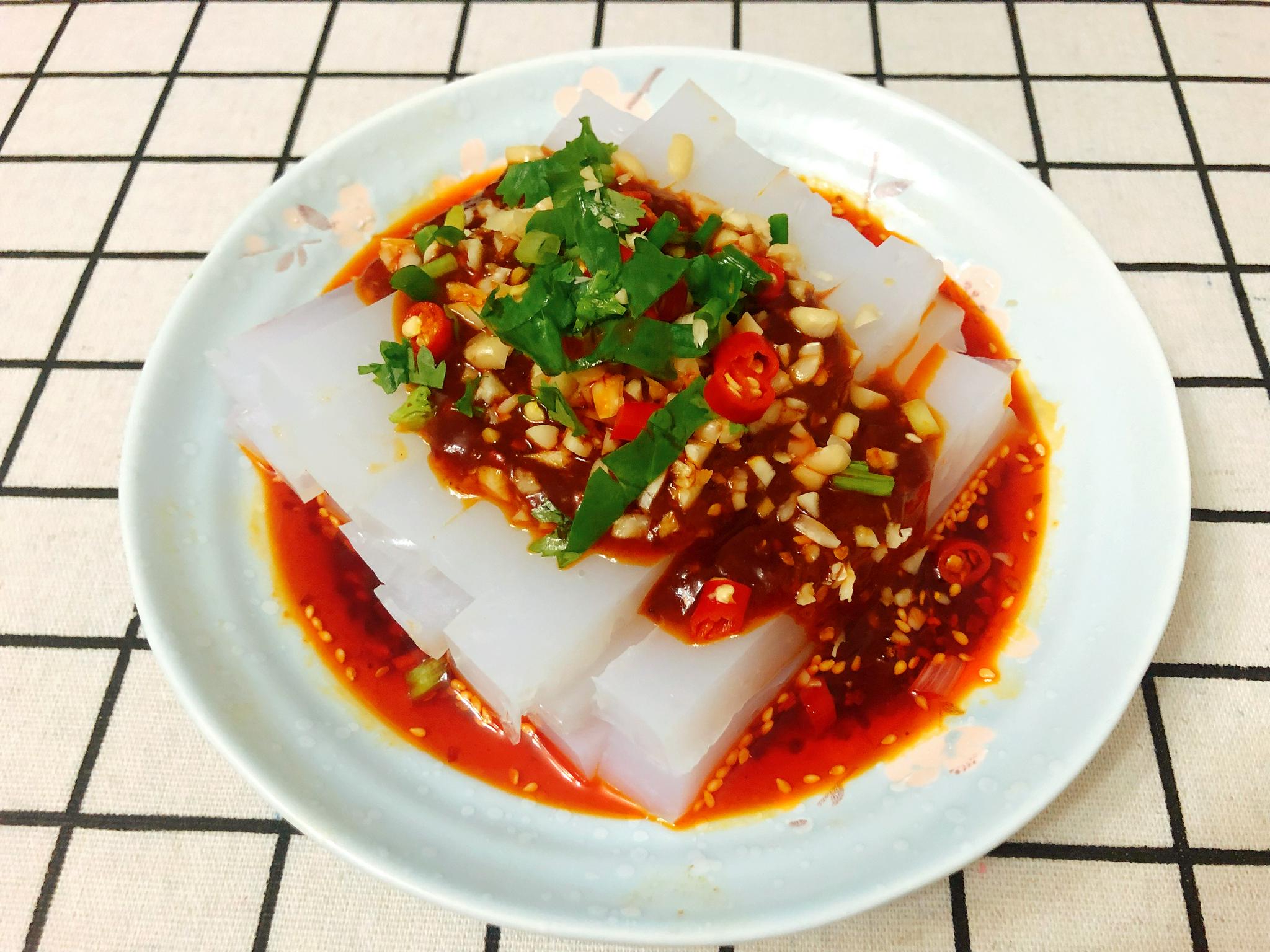 食材:凉粉、猪肉、炸好的花生、桃园建民牛肉耗辣椒、葱姜蒜、香菜、青椒、醋、香油、酱油、淀粉、胡椒粉、盐