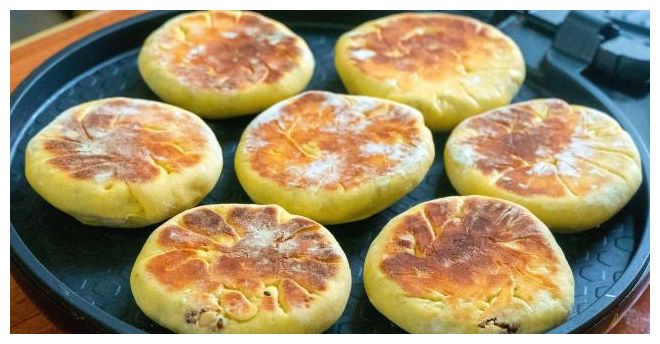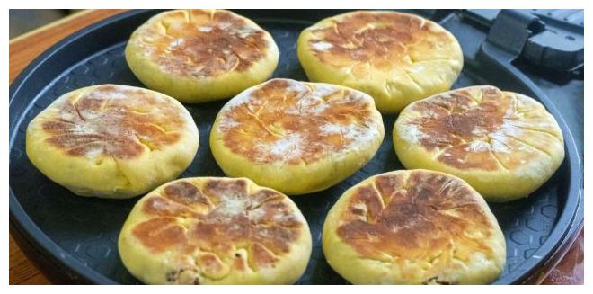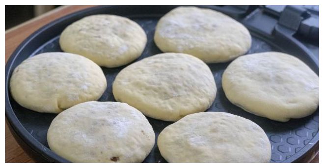 二次醒发后的面饼体积会变大变轻,然后直接放入电饼铛中,不用刷油的,盖上盖子小火烙就可以了,三分钟翻一次面,这样做的饼很容易熟,翻两次面就熟透了。