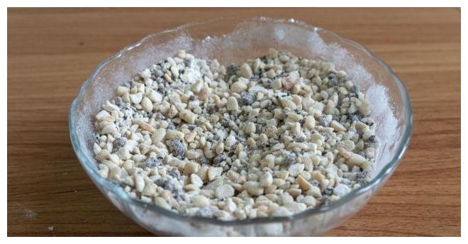 全部搓好后倒入盆中,用擀面杖捣成花生碎,像这样就可以了。