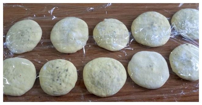 面团醒发好后我们给它排排气,放砧板上揉个3分钟左右就可以了,然后整理成长条,分成大小相等的面剂子,再将每个面剂子继续翻转揉搓,整理成圆形后用手掌压成小饼,再用擀面杖擀开擀薄。