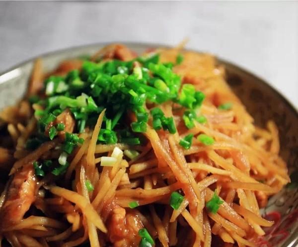 4 、热锅中留少许油,爆香葱段,再放入切好的土豆丝、胡萝卜丝拌炒,加入半杯水及少许白糖、盐、胡椒粉,记项翻炒至土豆和胡萝卜熟软,放入肉丝及少许鸡精,一大火炒匀即可。