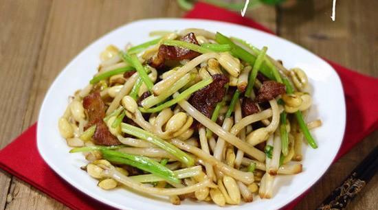材料:花生芽500g 、五花肉50g、 香芹100g、油适量 盐适量 白糖适量 生抽适量