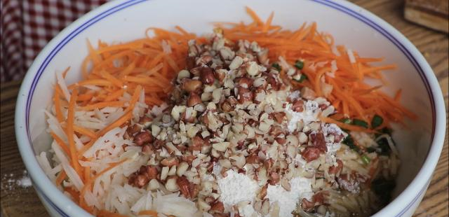 4、 倒入莲藕胡萝卜里,加入1大勺面粉,搅拌成稠糊状。