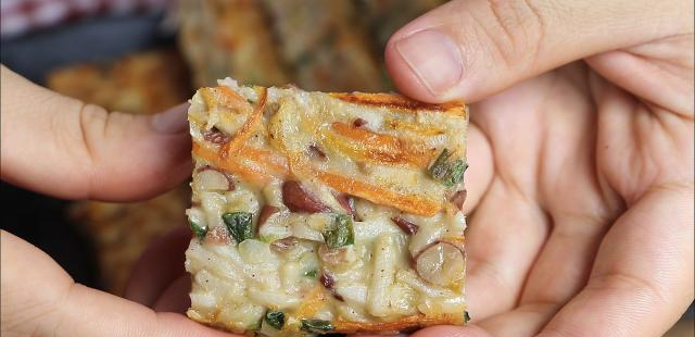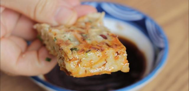 7、 切成小块就可以开吃了,莲藕饼这样做,很软,里面的花生和藕丝有点脆脆的,很清淡,也很好吃,老人孩子都非常适合。