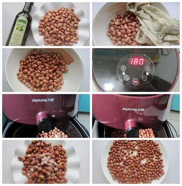 主料:花生米辅料:橄榄油、盐做法:1、把花生米用湿纱布来回搓几遍,直到干净为止2、把花生米加大碗里,加一勺橄榄油,搅拌均匀,使每颗花生米上面都沾到油3、把花生米倒入空气炸锅的篮子里,空气炸锅通电,设置温度180度,时间10分钟,推进炸篮中间可以将篮子取出晃动一下使受热均匀。