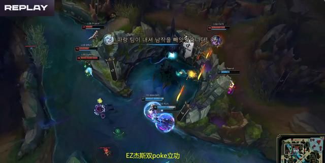 在开局的对线中NS下路双人组成功打出了英雄压制效果,EZ卡尔玛一直占据线权,面对沙盒的先手gank,deokdam EZ不慌不忙转身集火将Effort锤石击杀拿到一血,Gori塞拉斯也交出TP支援将王子哥金克斯击杀,缓解了一下对线压力!