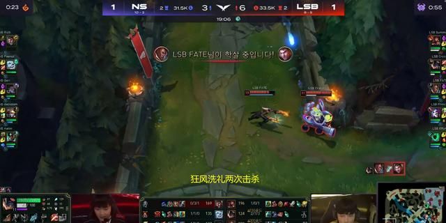 在中期的单带线上,沙盒也有所准备,FATE无解肥发育的卢锡安,连续两波配合Croco兰博远程大招减速,直接狂风之力加圣枪洗礼,追着NS单线人员将大招伤害拉满,上下路都是完成一次击杀,沙盒成功滚起雪球占据前中期一定的优势!