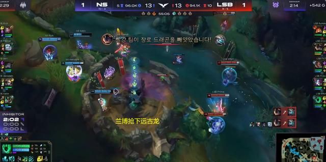 53分钟的大龙团战里,Rich杰斯被Effort锤石钩子命中先行白给的情况下,deokdam EZ站了出来配合Kellin卡尔玛不断地拉扯风筝收割战场,NS打出二换五团灭沙盒成功控到大龙,但即将双龙会时,NS选择先整理三路兵线再拿远古龙。导致第一时间龙坑里沙盒已经布置好了视野,看到NS准备rush远古龙时,野辅就在一旁蹲伏,到达斩杀线瞬间开启皇冠加速送Croco兰博冲进龙坑,拼惩戒小花生佛耶戈失误,兰博成功抢到远古龙再接灯笼跑路!