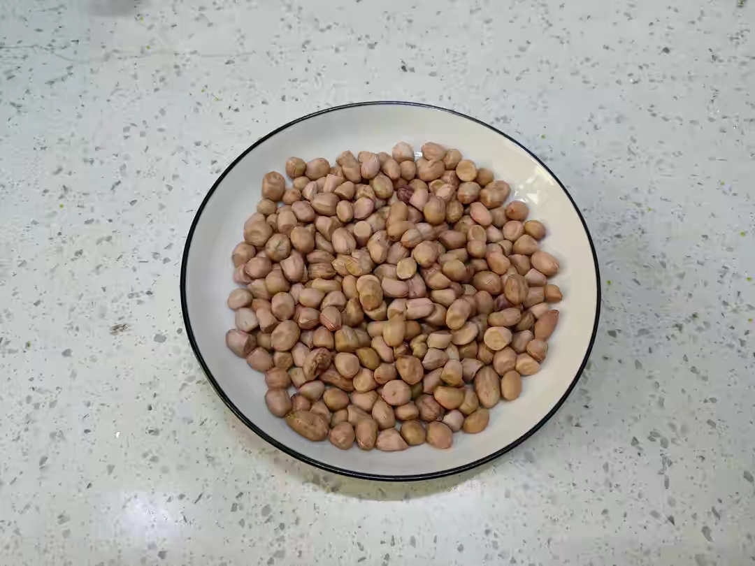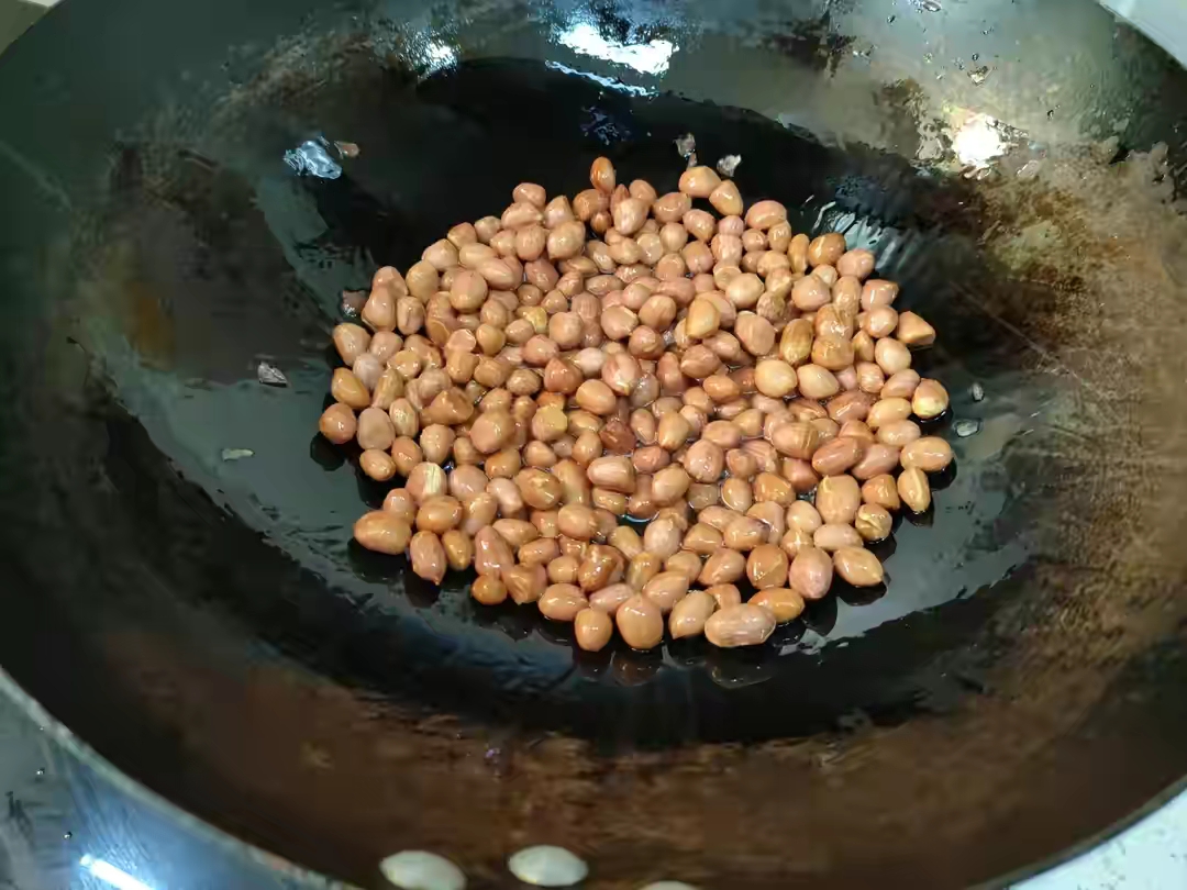 1、首先咱们,先炸花生米,准备个头均匀的花生米一盘,然后锅烧宽油,将花生米凉油下锅,然后开中小火,一直边推边边搅,直到花生米出现噼里啪啦的声音,外表微微发黄就可以捞出来,平铺在盘子上晾凉,过程大概五分钟,如果把外表炸红,那么出锅后就炸糊了。