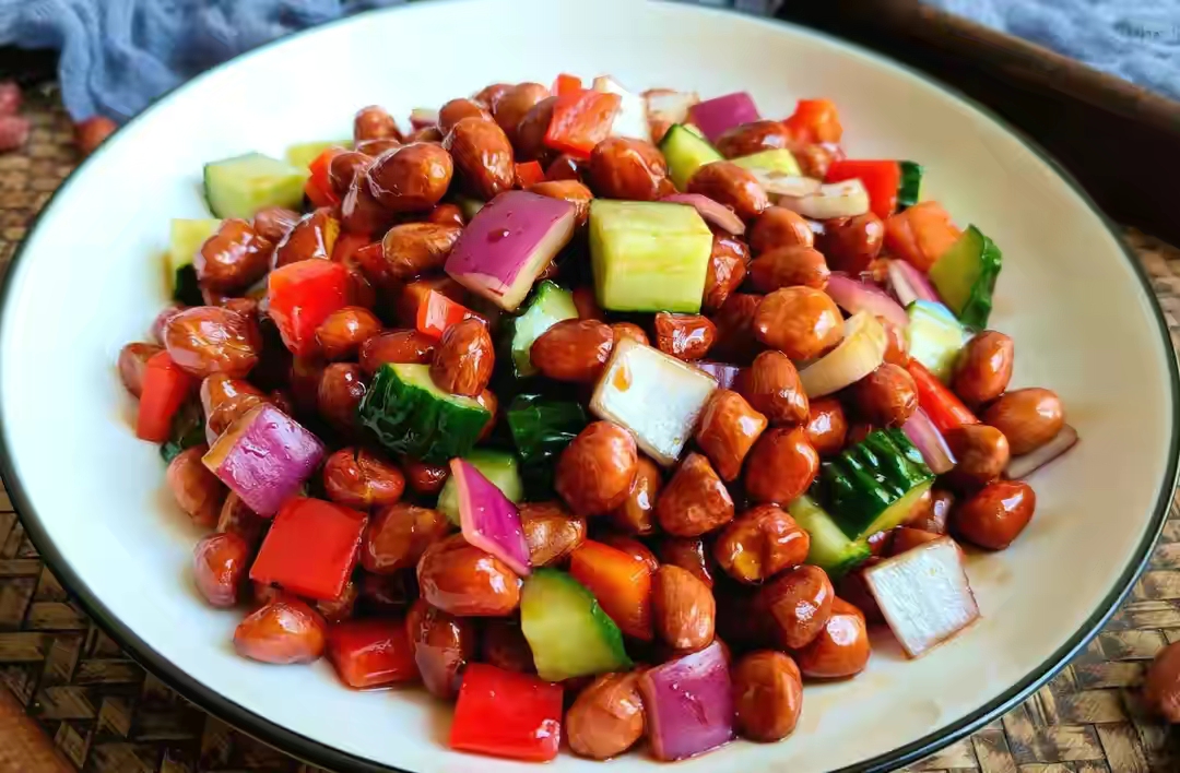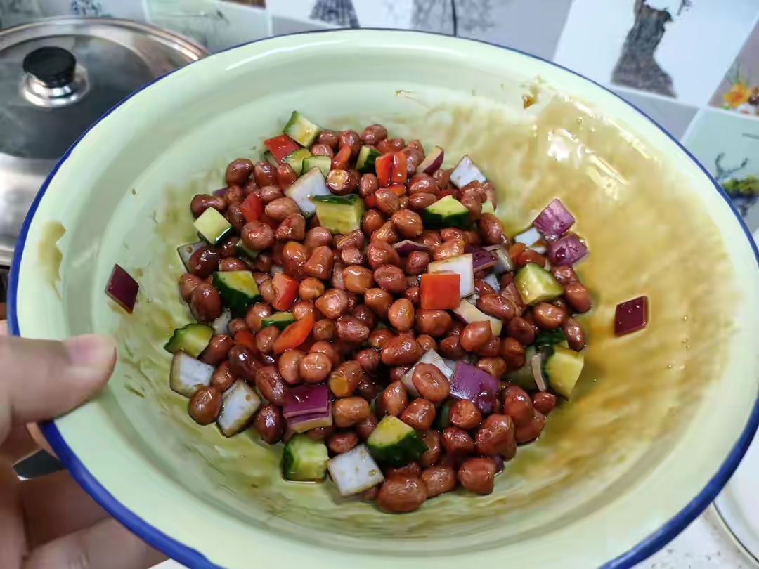 3、最后咱们切上点洋葱丁和尖椒丁,放在糖醋汁里面,再将晾凉的花生米,放在里面迅速搅拌均匀,就可以吃了。
