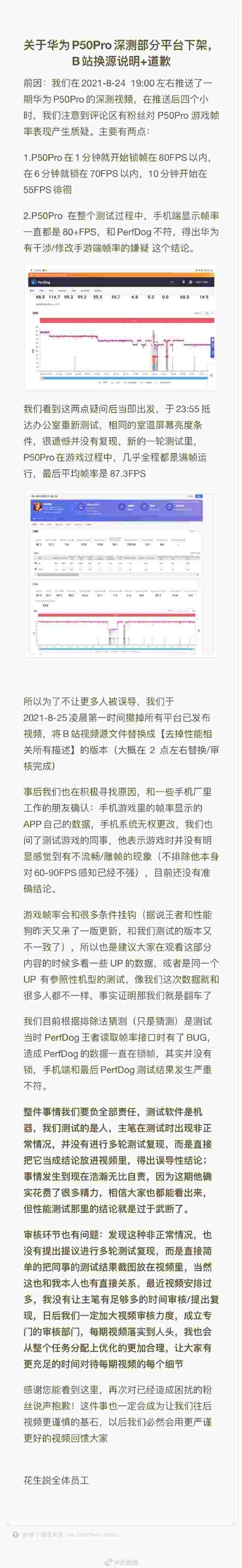 8月25日,数码自媒体@花生説发表声明,就P50 Pro游戏测试中的错误结果致歉。