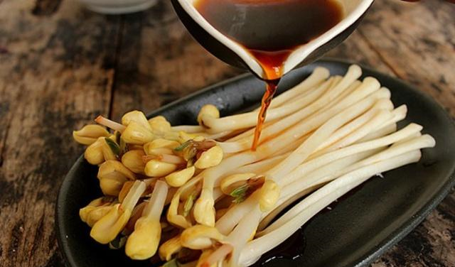 【清炒花生芽】 锅中油热后放入葱丝姜丝炒出香味,花生芽倒入锅中翻炒,加生抽,出锅时加盐即可。