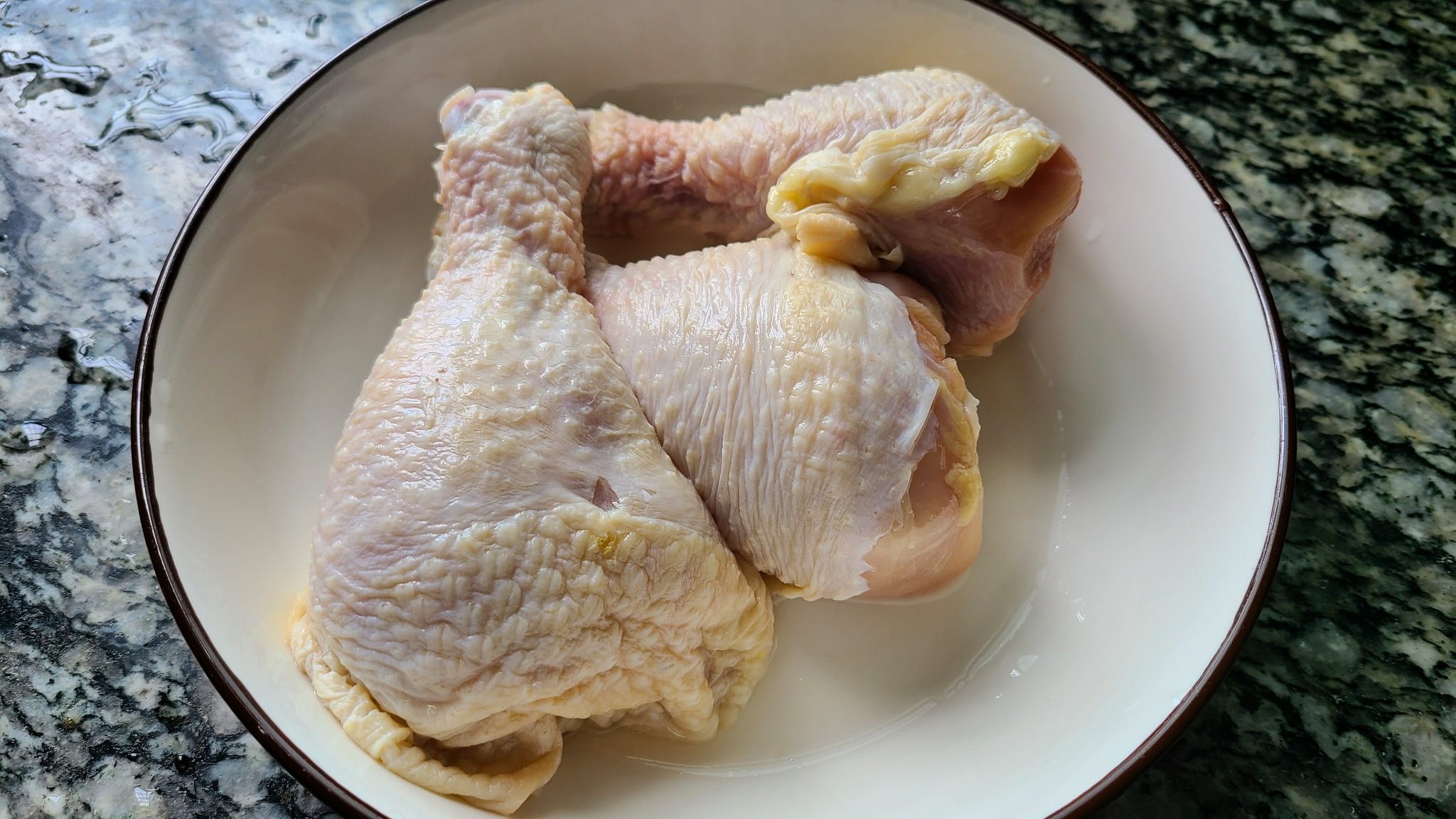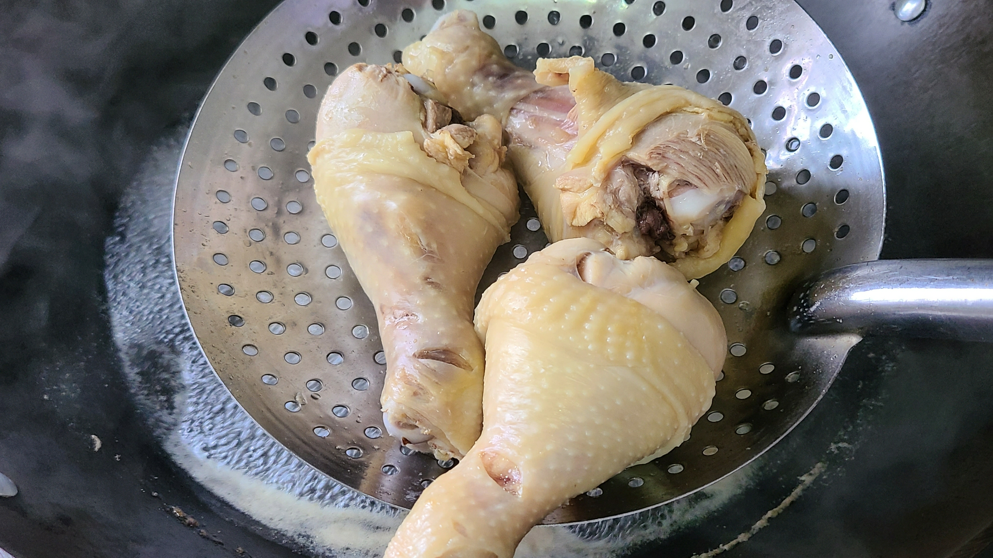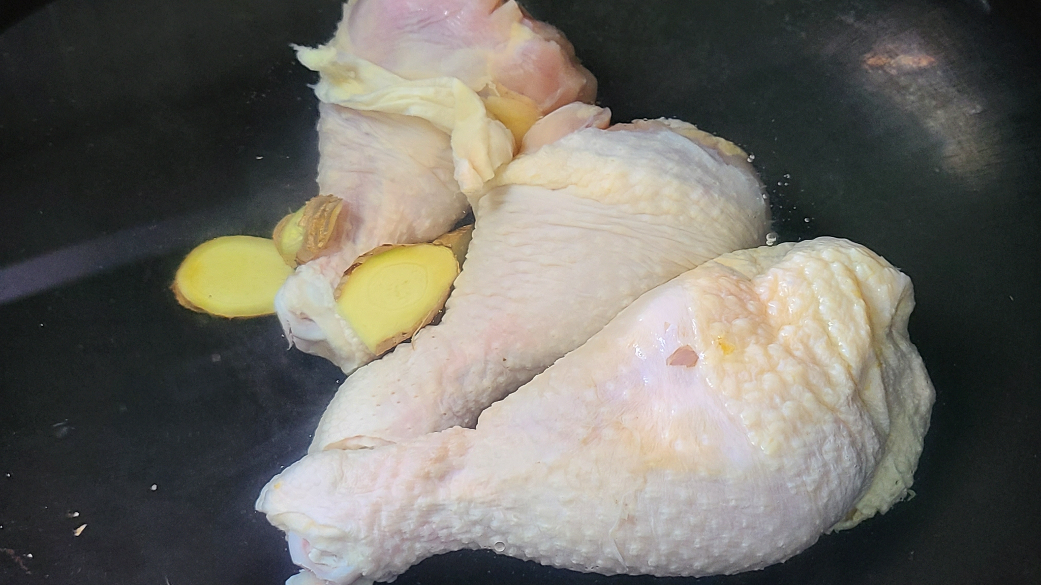1.准备3只大鸡腿,把它清洗干净,然后冷水下锅,放入生姜跟料酒去一下腥,煮熟后,把鸡腿捞出来放一边放凉备用。