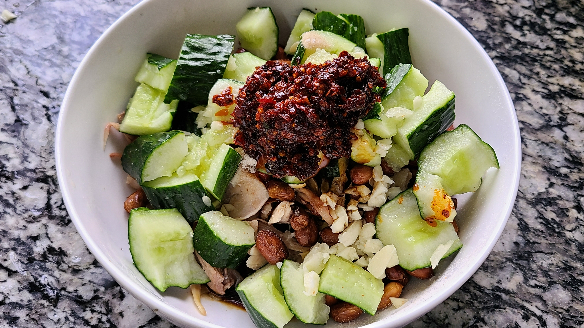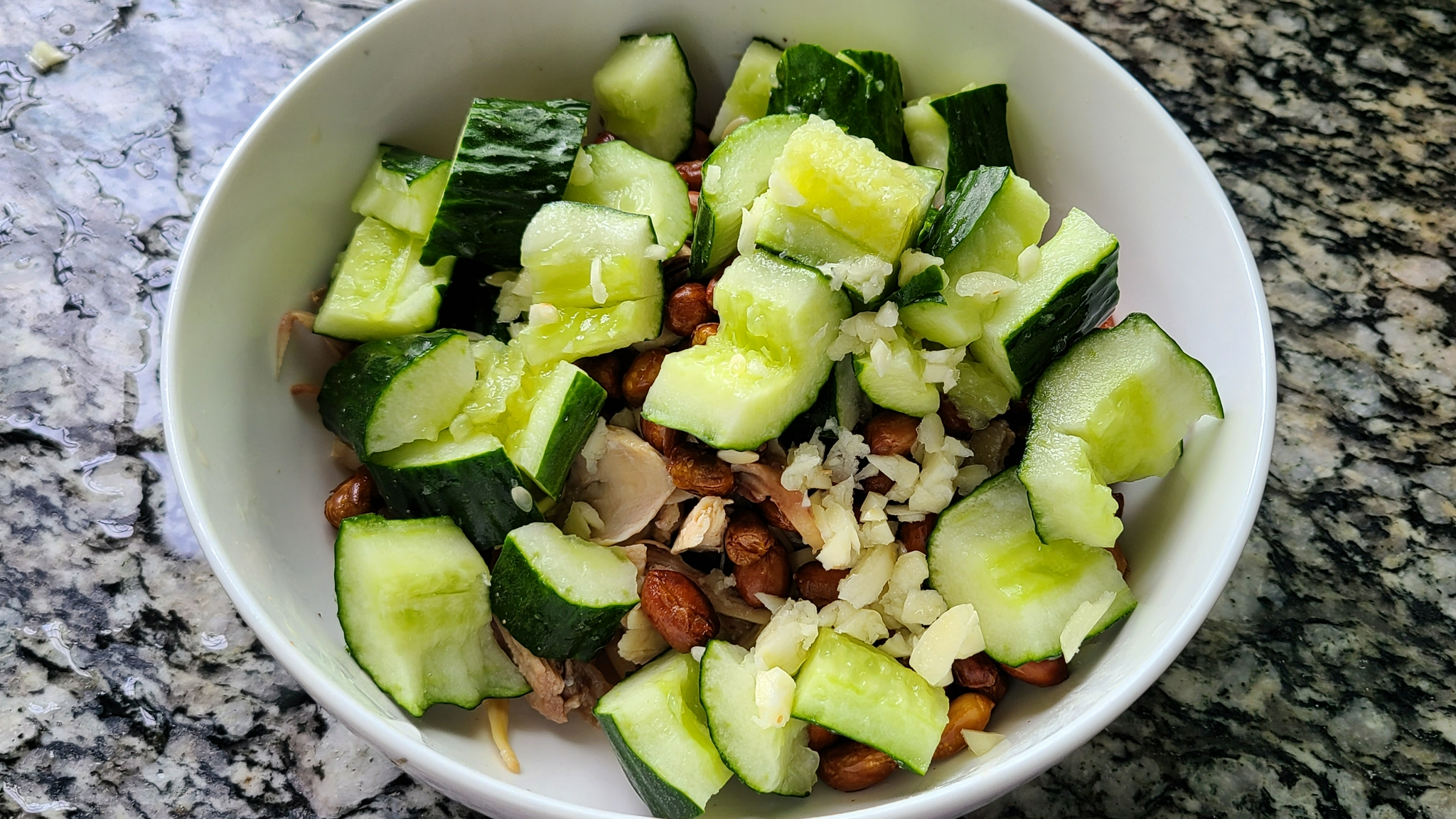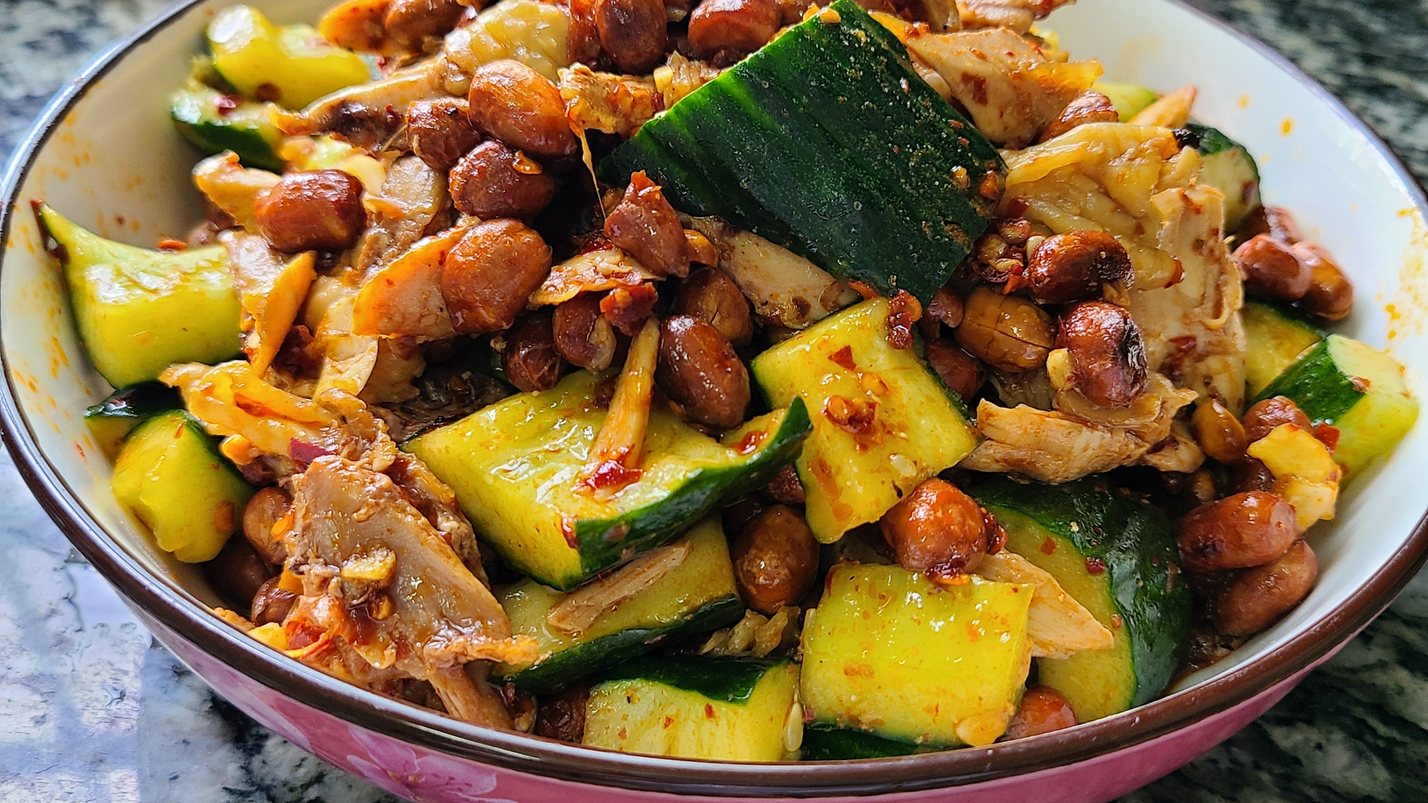 4.鸡腿撕好之后,把黄瓜、花生跟蒜末倒进去,接着来调一下味,碗里放入少许的盐焗鸡粉、一勺白醋、一勺香油、一勺生抽、2勺老干妈(或者辣椒油),喜欢吃香菜的也可以放上一点香菜,把它们全都搅拌均匀。