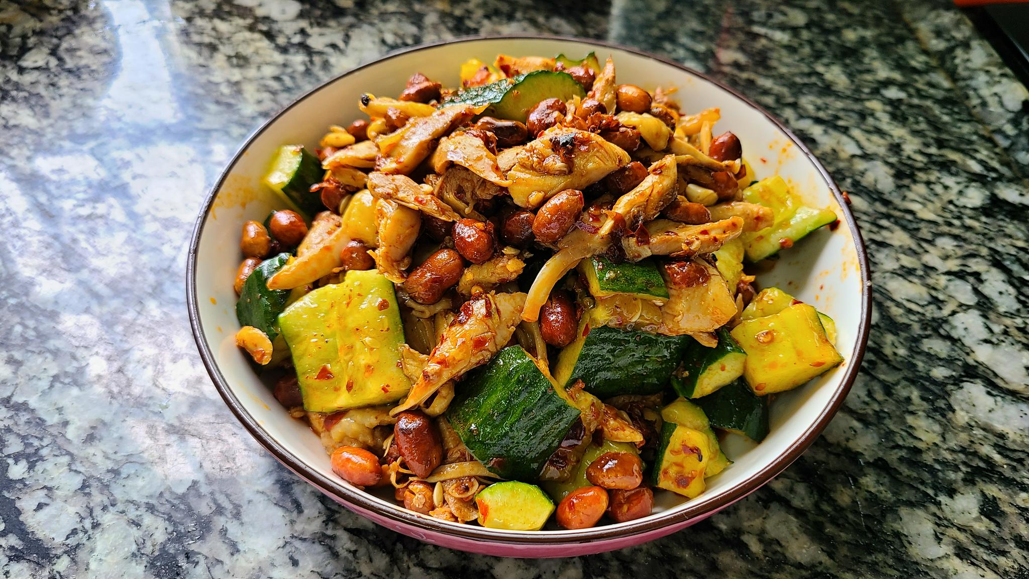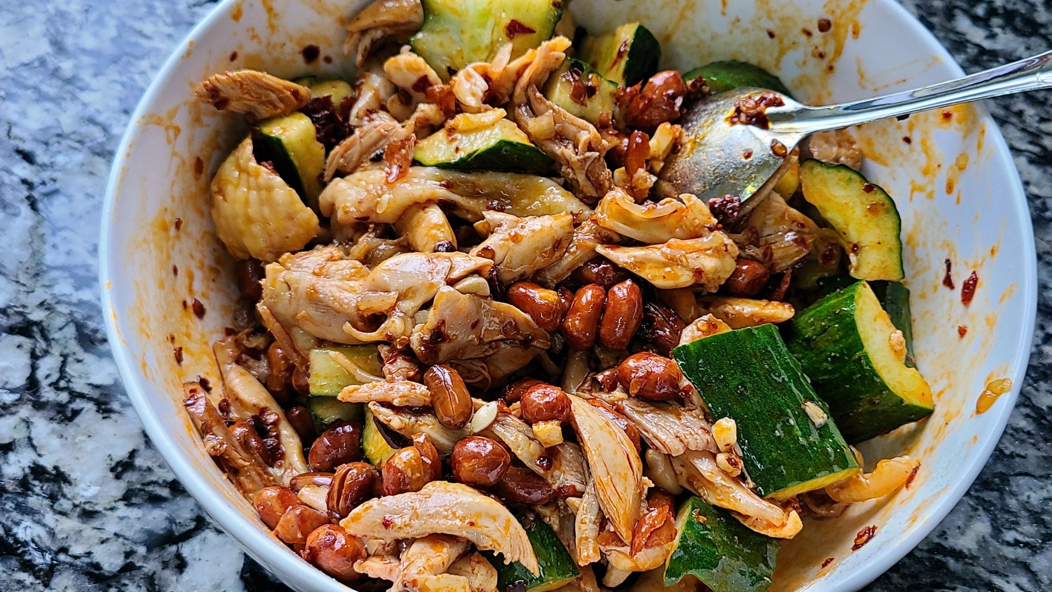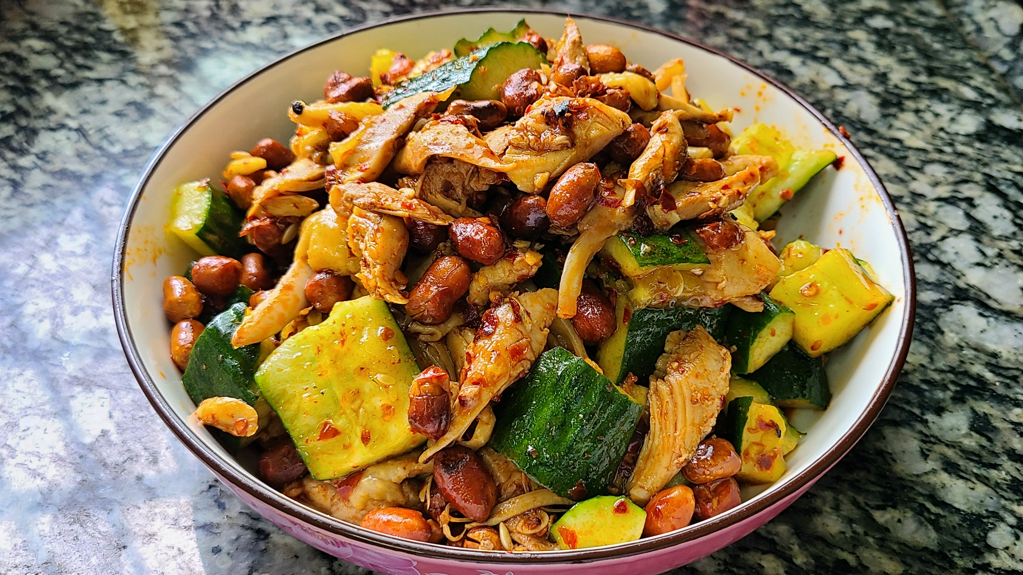 4.鸡腿撕好之后,把黄瓜、花生跟蒜末倒进去,接着来调一下味,碗里放入少许的盐焗鸡粉、一勺白醋、一勺香油、一勺生抽、2勺老干妈(或者辣椒油),喜欢吃香菜的也可以放上一点香菜,把它们全都搅拌均匀。
