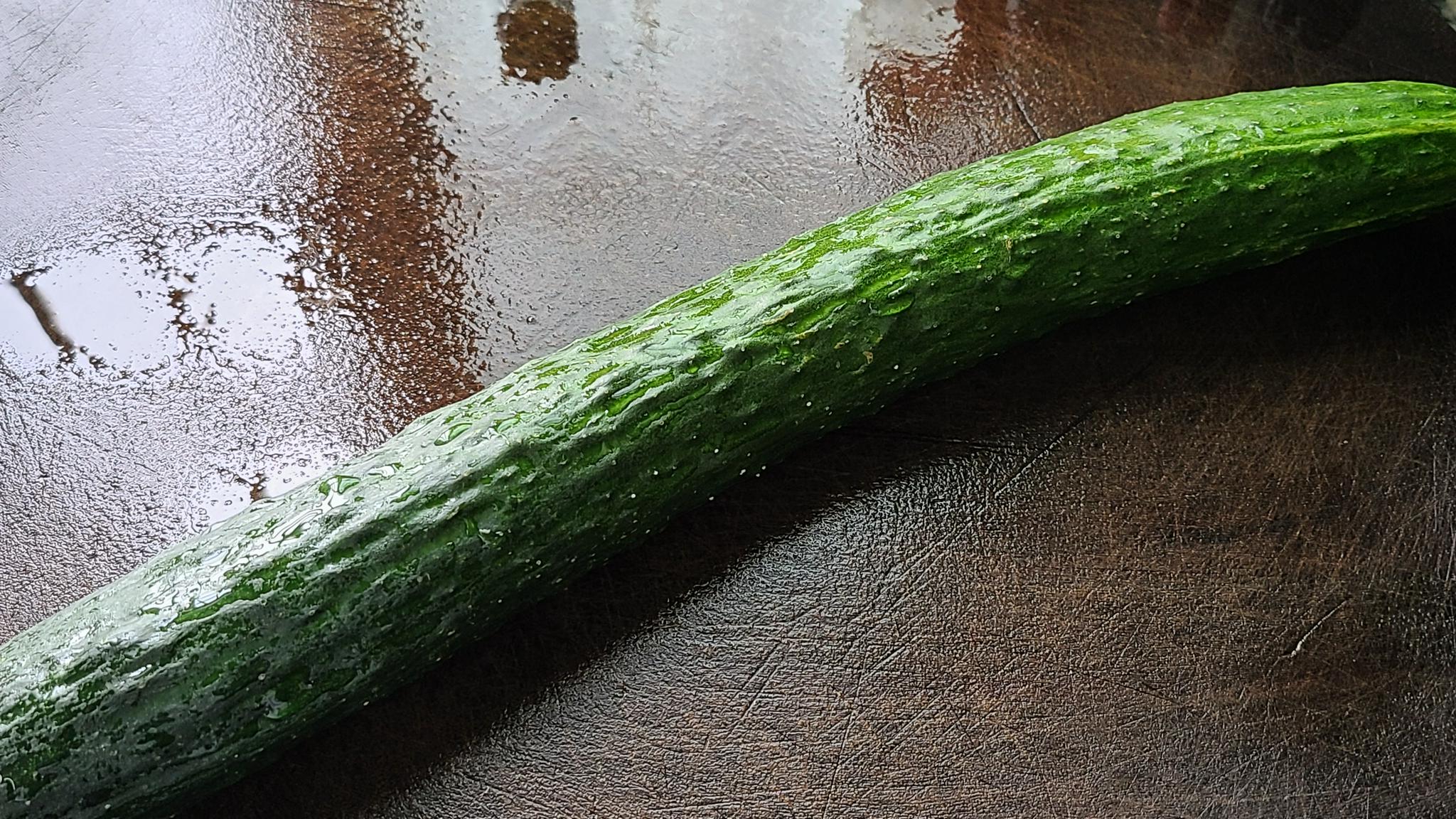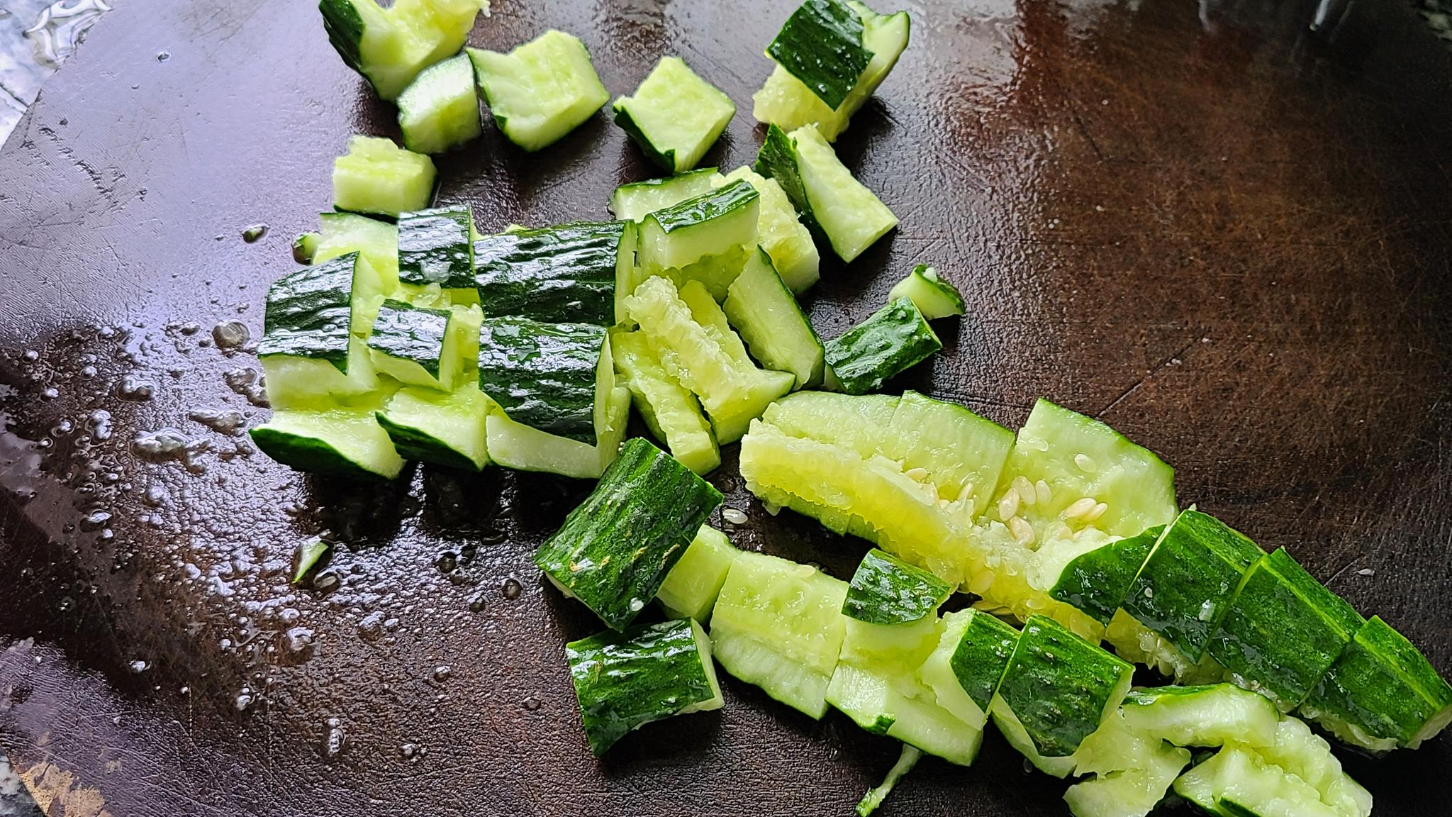 2.准备一根黄瓜,先把黄瓜拍一下,然后把黄瓜切成段备用。准备半碗的花生米,把它清洗一下,稍微沥干一下水分,然后把花生放入冷锅冷油里面,全程开小火慢慢炒,不要用大火,不然容易糊。