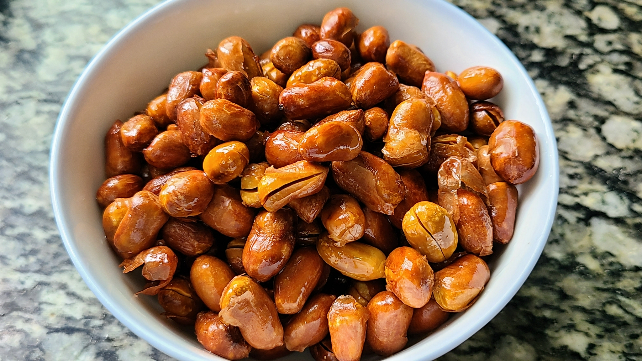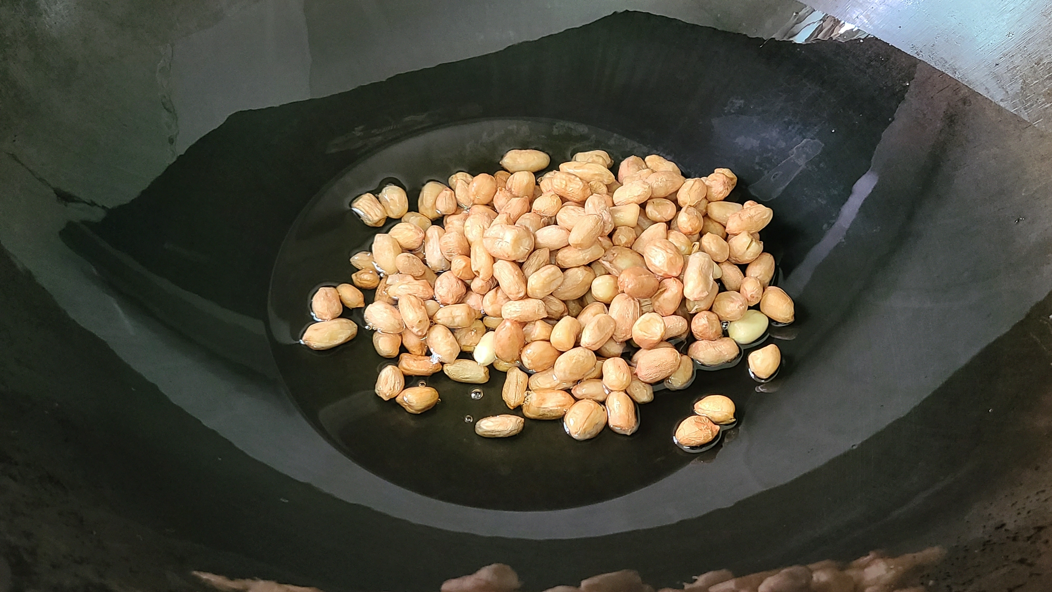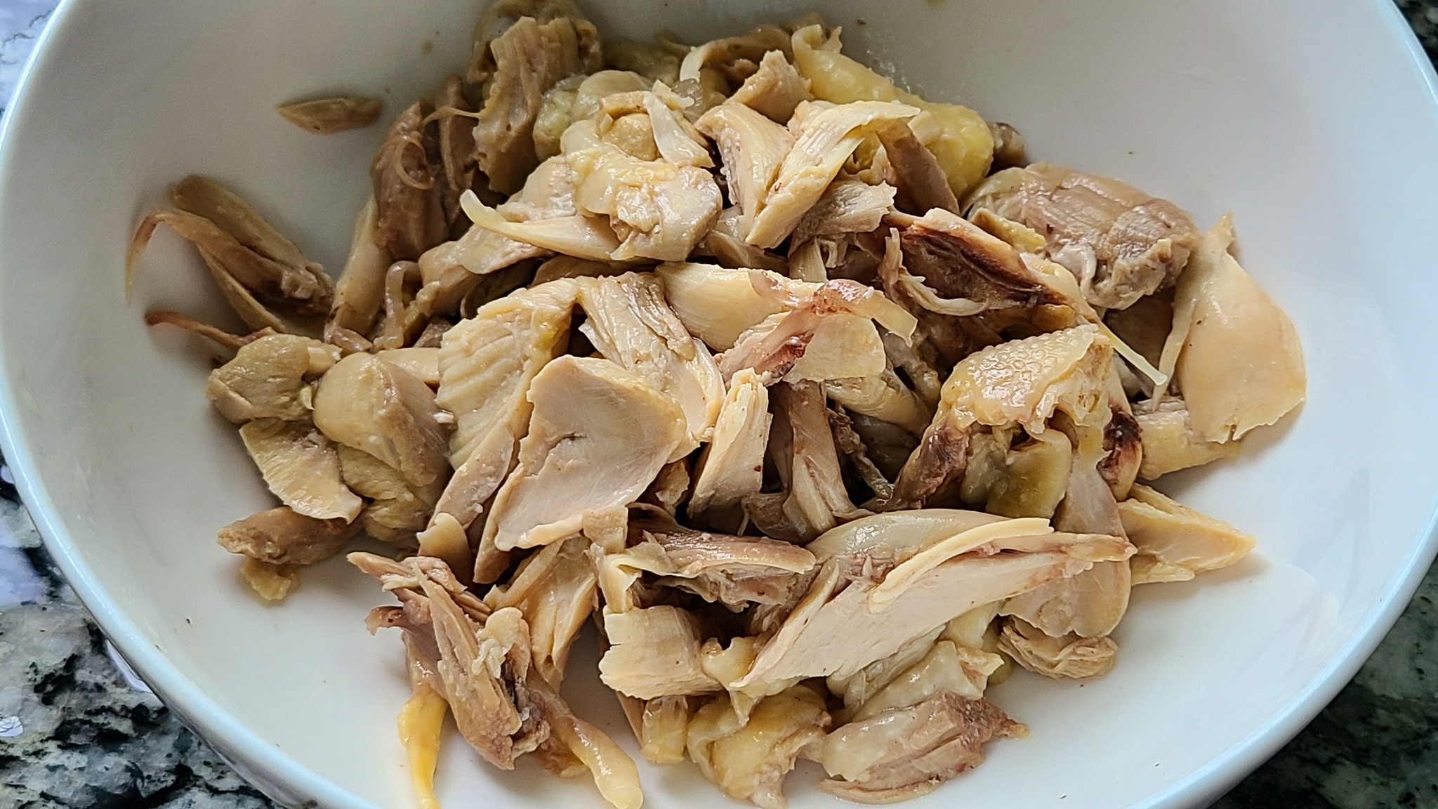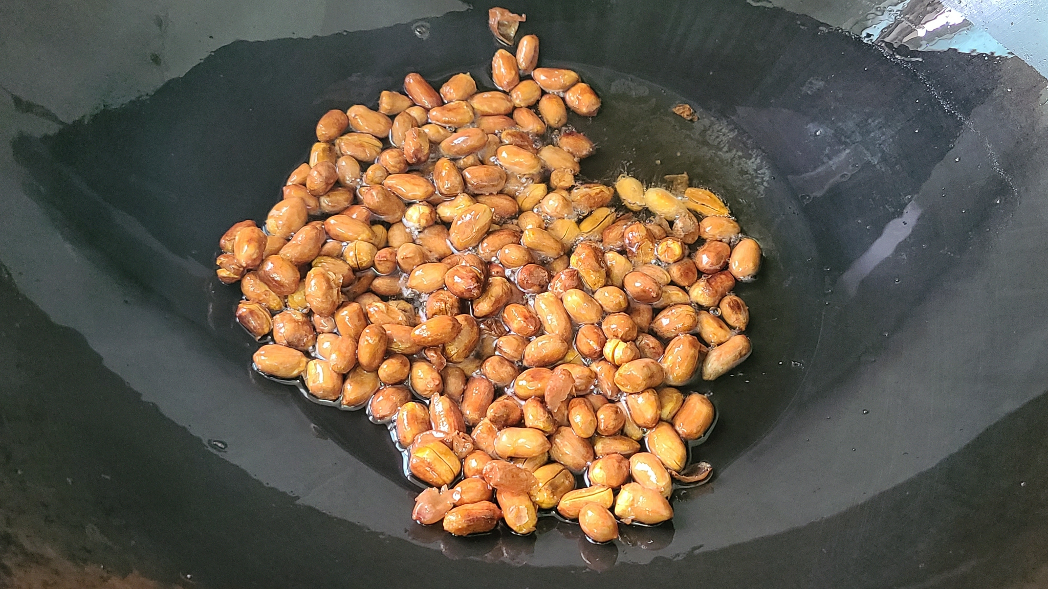 3.把花生炒成这样子,就可以了,关火出锅,把花生放一边备用。鸡腿放凉后,带上一次性手套,把鸡腿撕成小块装入盘中,可以撕大块一点也可以撕小块一点,根据自己喜好来。