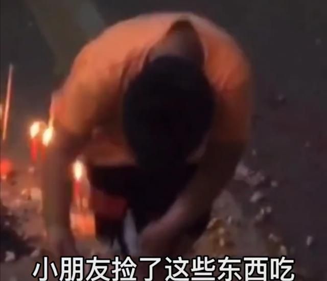 只见他将路人祭祀用的花生(贡品)连忙从地上抓起来放入自己的短裤口袋当中,行动非常的迅速。在此时还有一名中年男子举起手机在旁边拍摄,小孩子越捡越欢……