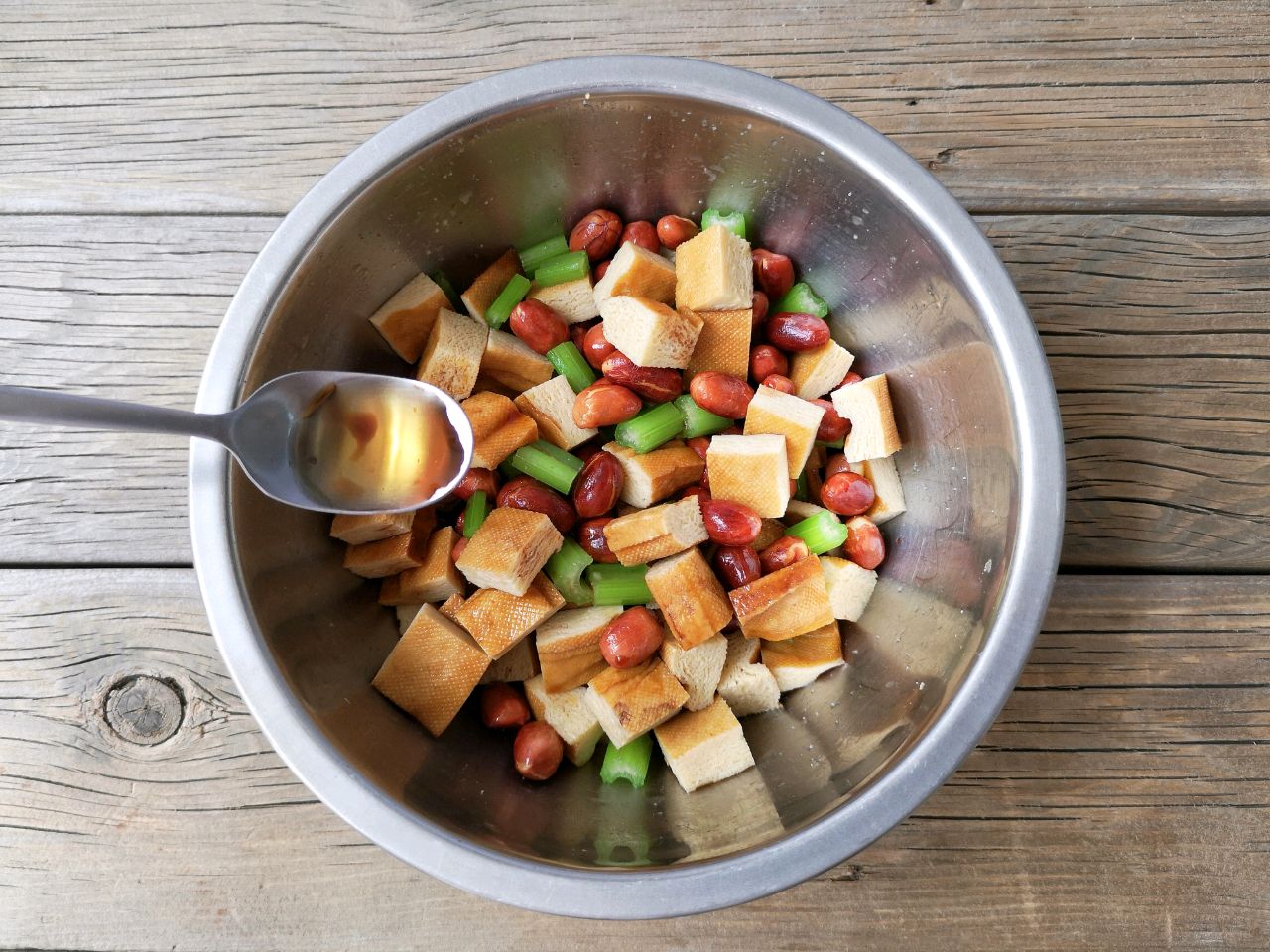 食材:豆腐干、花生仁、桃园建民牛肉耗辣椒、葱姜蒜、青椒、香菜、醋、香油、酱油、胡椒粉、盐