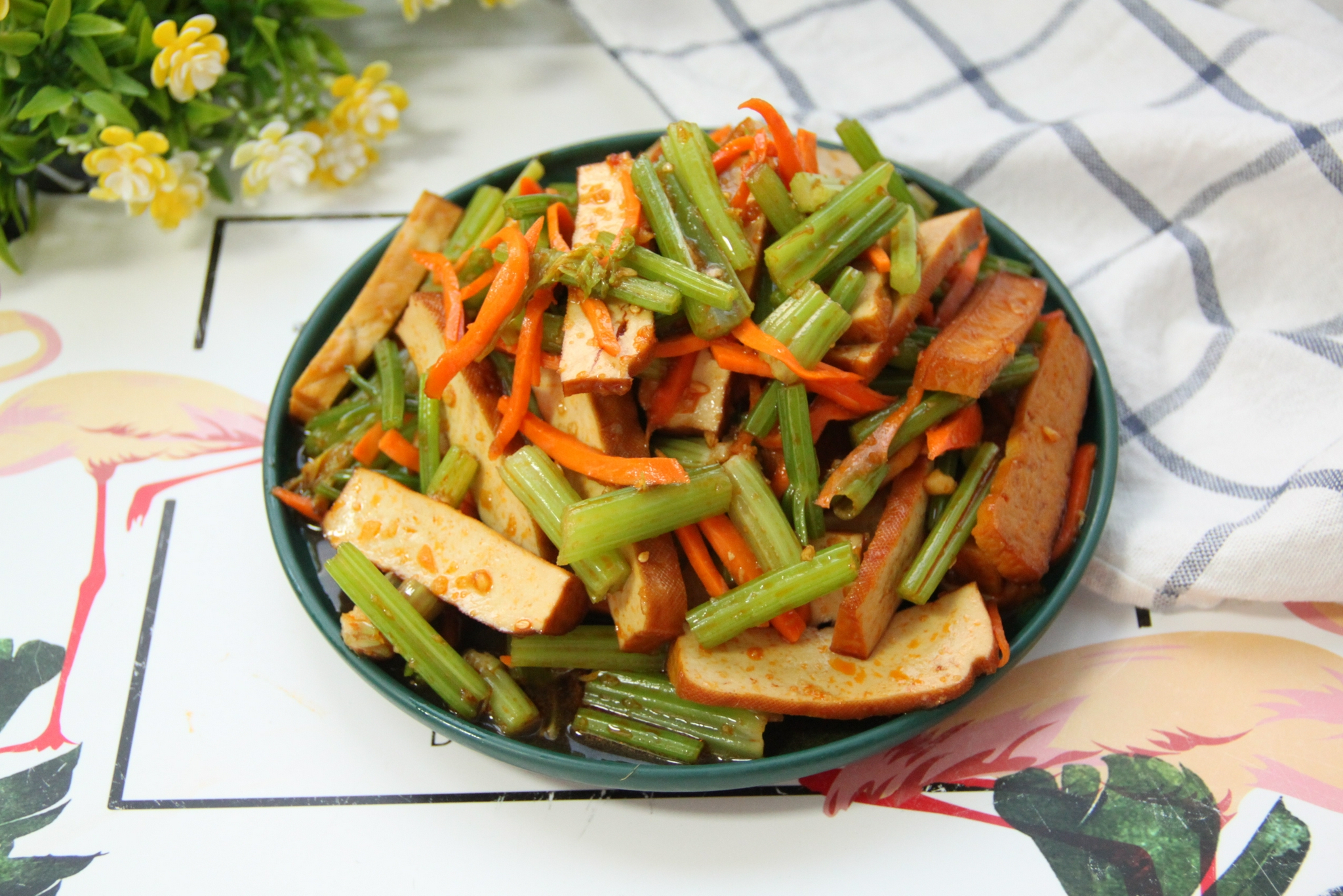 做法:1、先把食材都处理好,把豆腐干冲洗干净,控一下水后,用刀切成小块;