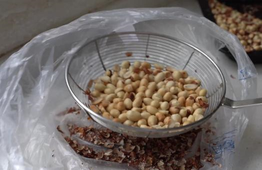 把放凉的花生米去皮,去皮直接用手搓。这个步骤有点费时。把搓好的花生米放进用筛子里,筛一下皮。