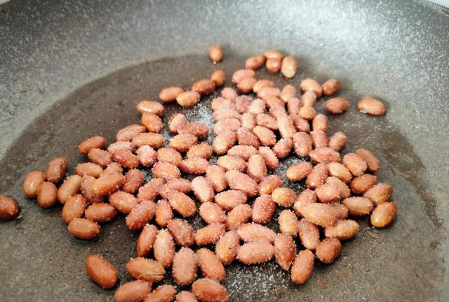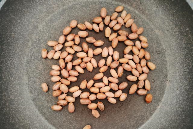 【步骤3】3、锅中花生米炒干水分时,我们倒入适量花生油,依然是保持小火,不停翻炒使其均匀受热。一直炒到花生米噼啪作响时,就可以关火了。