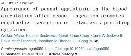 花生凝集素进入血液循环后,还会在癌前细胞和癌细胞上与一个特殊的糖链结合,并与血液中肿瘤细胞表面表达的一种蛋白质相互作用。这种相互作用触发了这种蛋白质的变化,导致癌细胞表面的潜在黏附分子暴露出来,使癌细胞更黏,更容易附着在血管上。