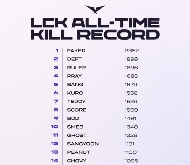 值得一提的是小花生在这场比赛中也刷新了里程碑,LCK生涯总击杀高达1100次,暂时排在第13位,要不是他来LPL打过几个赛季的话,他在LCK的总击杀数肯定更高,从排名中也可以看到1000杀以上选手打野比较少,基本都是C位,这也更多说明小花生风格有多凶悍。