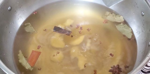 花生捞出来了,我们在煮花生的汤汁中放进花椒皮,盐要多加一点,香叶,桂皮,八角,姜片,再倒进少许水,点火继续煮上5分钟,煮出料头的香味,把汤汁放凉。