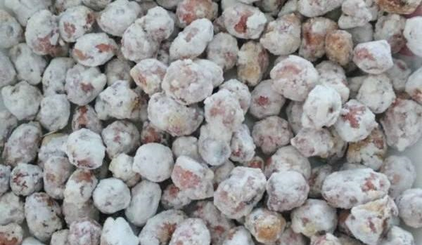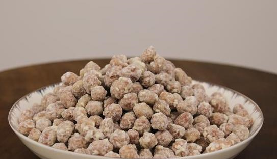 最近就出现了挂霜花生的说法,刚开始看到图片的时候以为外面就是一层淀粉,只有当场品尝过的才知道,外面只是裹着白糖的外衣,不过这不是直接撒糖做出来的,糖分已经跟花生融为一体,而且糖分里面还有一层面料包裹着,难怪看起来这么好看。一般炸熟或者炒熟的花生多多少少有发黑的颜色,向老板打探下相关的做法,回到家里自己尝试着做了一遍。