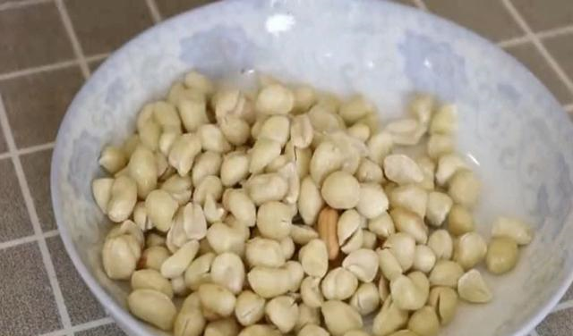 第三步:我们再把浸泡好的花生米去皮后放入盘中控干水备用。