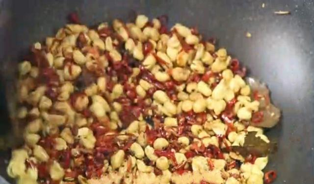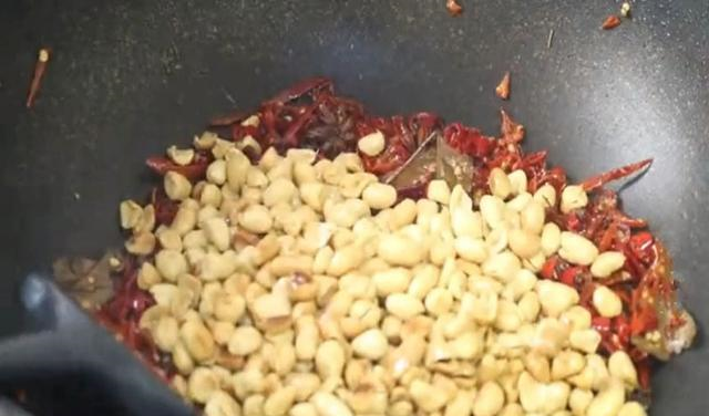 第五步:锅中留底油,放入八角两粒、香叶三片煸香后再将浸泡好的辣椒和花椒粒煸香,然后再将油炸好的花生米倒入锅中继续翻炒。