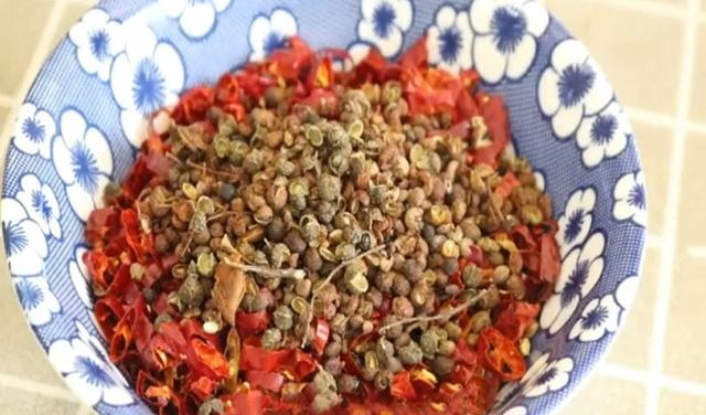 第二步:我们将准备好的干红辣椒用剪刀剪成斜块,然后再将青花椒粒一起放入碗中倒上清水浸泡十分钟左右(这样做的目的是在炒制的时候能更加入味)。