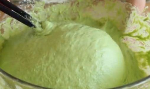 榨好的菠菜汁用筛子过滤一下,然后用过滤好的400克菠菜汁和面,边倒边搅,搅成这样的面糊。